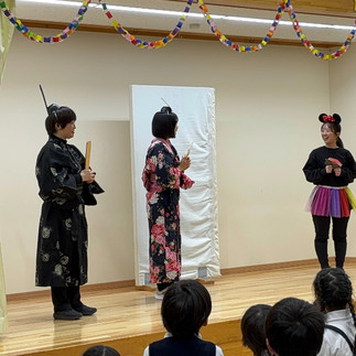 1月生まれの誕生会が行われました。今月は3名と少ない人数でしたがホールで全クラス参加で行いました。歌やゲームや先生達の出し物で、みんなで楽しい時間を過ごしました。